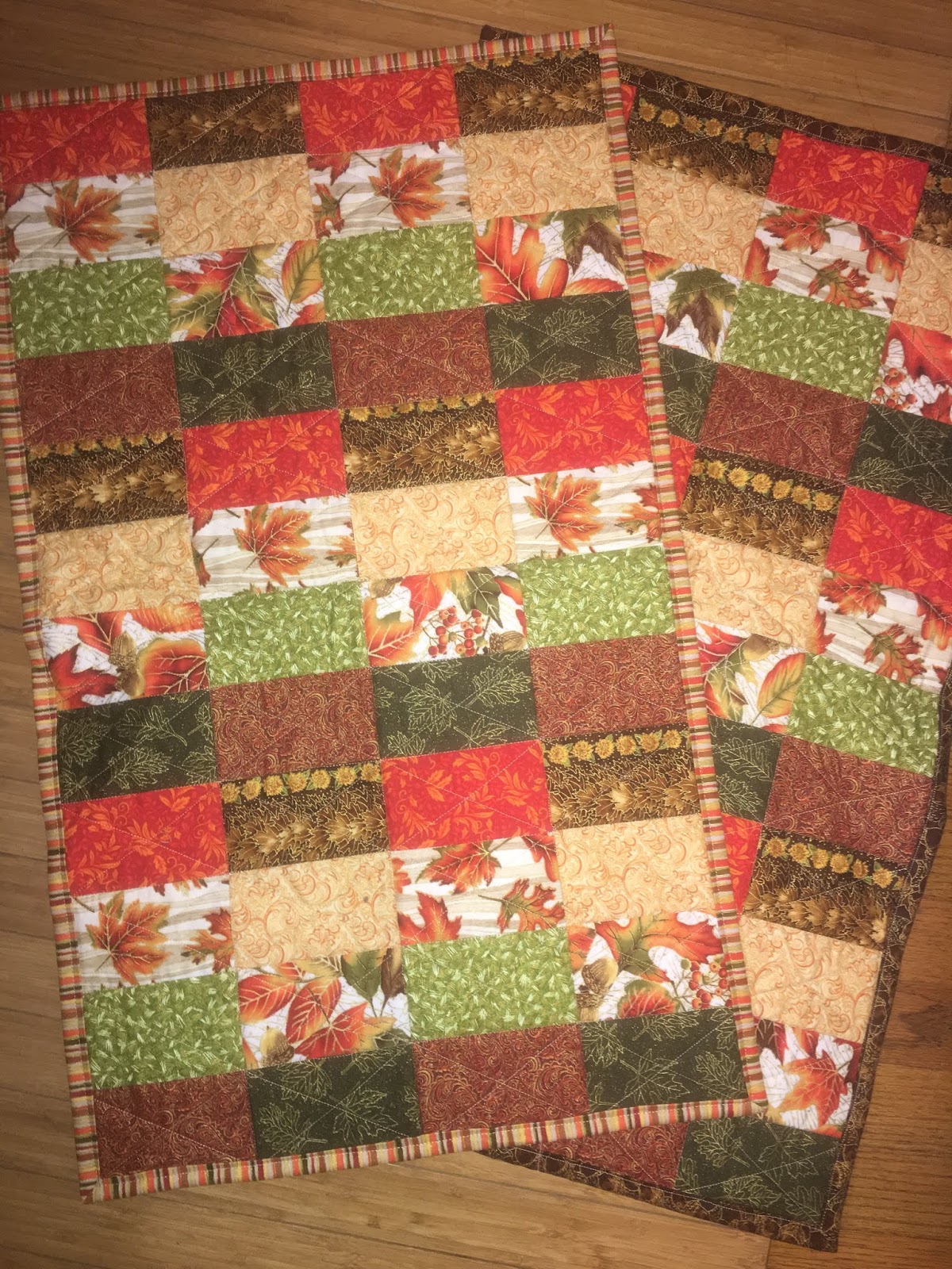 After making my sister Beverly her placemats (as shown here) I had a bunch of the fall fabrics left over so I cut into rectangles and made 2 little table runners for my guilds annual boutique.