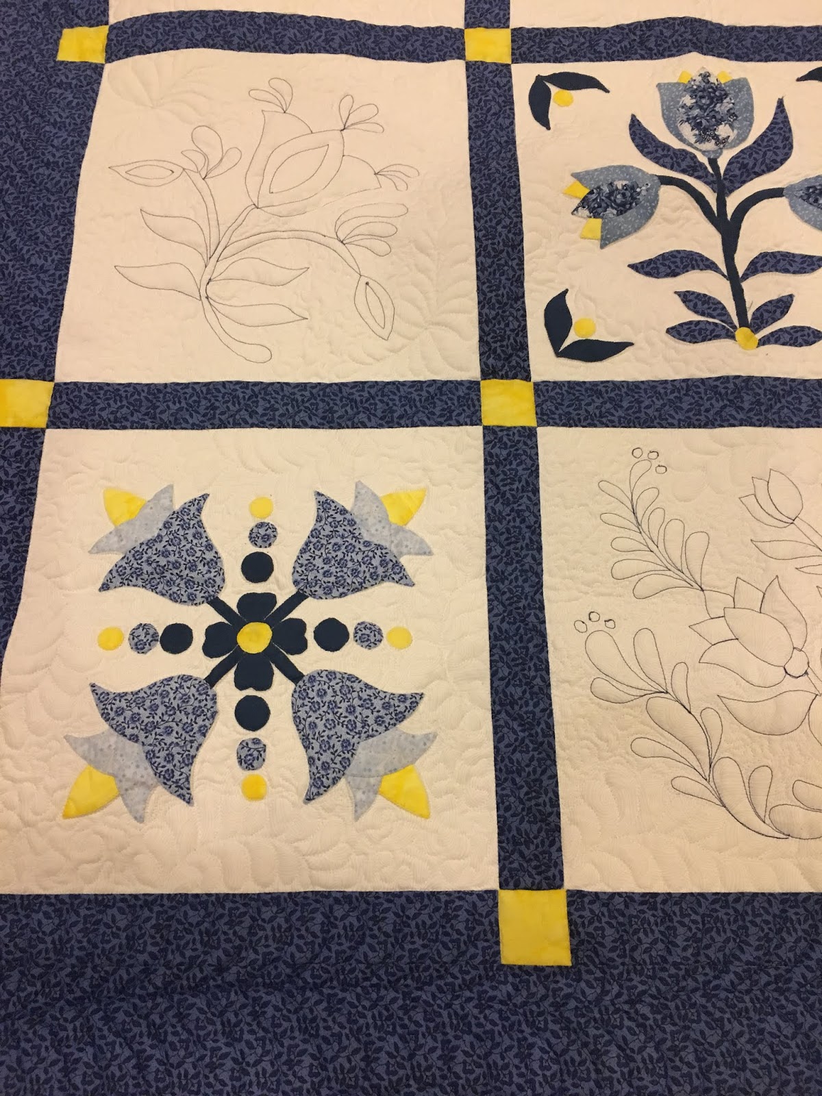 So because I've been sitting at the hospital a lot, I have been doing a lot of stitching. The light isn't ideal, but I do what I can. I did sew the binding down one night on the Dutch floral applique I showed above. I have been trying to get some sewing done in the morning as my sisters have been taking the early morning and days shifts. It has become my true therapy.